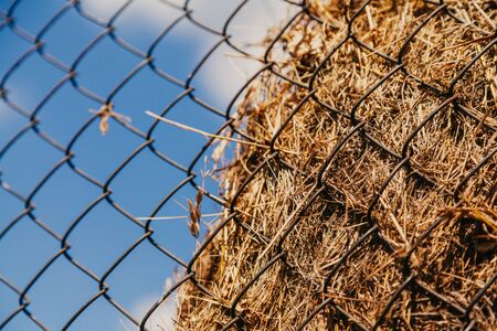 Agrarian story. Grid and Hay. Dry grass laid behind the grid with large cells against the blue sky close-up
