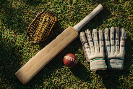 Cricket equipment including a bat and ball arranged on a green field with cricket stumps standing upright, symbolizing the sport and outdoor recreational activities in a natural setting