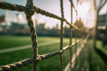 Frayed soccer net strands catch warm light, while a lush field and distant cityscape fade softly in the background, evoking peaceful sports memories during sunset.