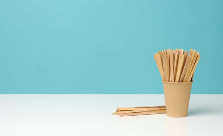 disposable paper cups and wooden sticks on white table, blue background, copy space