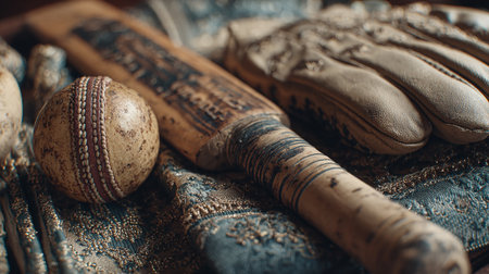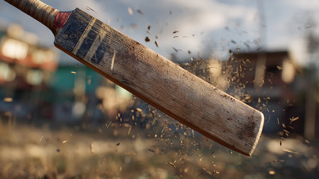 A broken cricket bat and damaged ball, evoking the concept of resilience in sports, reflecting the wear and tear of dedication and the journey athletes undertake in their pursuit of excellence.