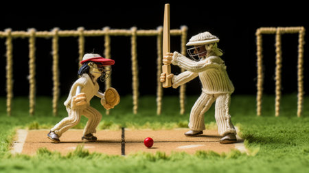 two toys play cricket in front of a wooden background on a dark background, in the style of photographically detailed portraitures, diorama, norman parkinson, alan moore, knitted and crocheted, shot on 70mm, dynamic and action-packed scenes. ai generated