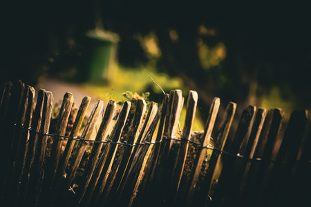 Vertical view with a selective focus on a wooden fence on a bright summer day, with a lawn and plants of a garden in a defocused background, strong bokeh, shallow depth of field, Sintra, Portugal