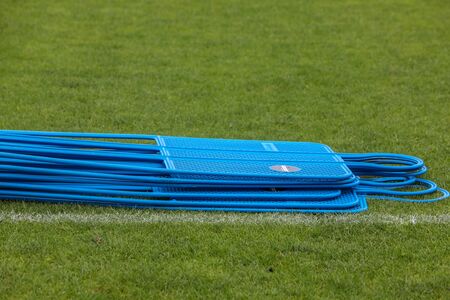Horst, Netherlands, June 24, 2018: Soccer (football), training dummies on the green field of the stadium