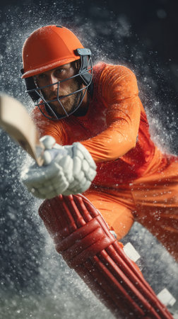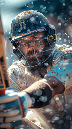 Cricket player in batting helmet captured mid-swing with water droplets frozen in dynamic close-up scene. Concept of impact, action, tension, energy, and sporting intensity.