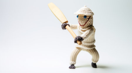 a crocheted miniature cricket player with a bat is captured in this uhd image, showcasing the traditional photographic techniques. the simplistic cartoon style adds a playful and ironic touch to the indigenous culture-inspired sculpture costumes, crafted with ivory. ai generated