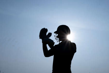Silhouette of a cricket player getting ready before the match in the evening. Indian cricket and sports concept.