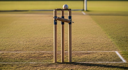 Close up of cricket equipment on a grassy pitch with white lines, illuminated by the golden hour sun against a stadium backdrop Evokes the atmosphere of the game