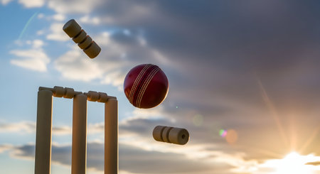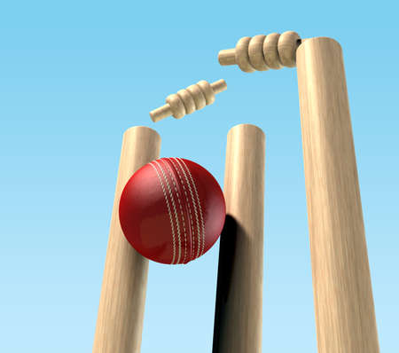 A red cricket ball striking wooden cricket wickets with dislodging bails on a day sky background - 3D render