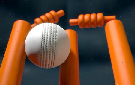 A close up of a white leather stitched cricket ball hitting orange wickets with dirt particles emanating from the impact at night - 3D render