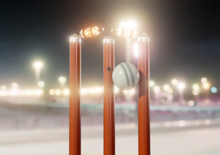 A white cricket ball striking orange electronic cricket wickets with dislodging bails and illuminating LED lights on a night sky background - 3D render