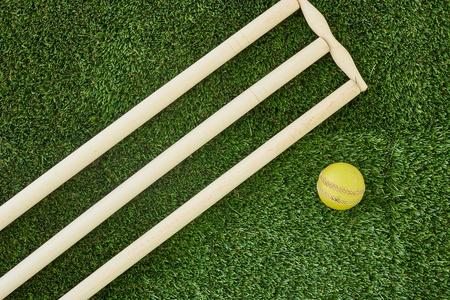 Cricket ball and bail on green grass playing ground pitch
