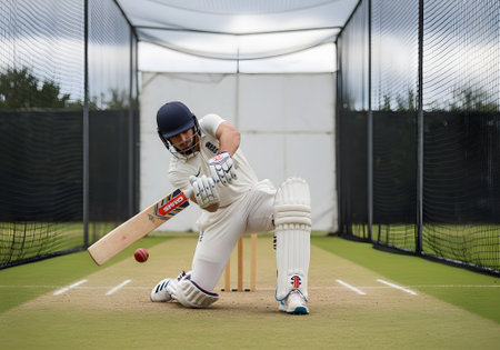 A cricket batsman in full protective gear is hitting a ball with his bat during a practice session inside a net, showcasing skill and athleticism