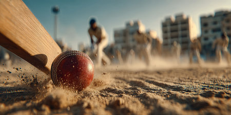 Cricket ball hitting the ground with sand flying in action sports moment.