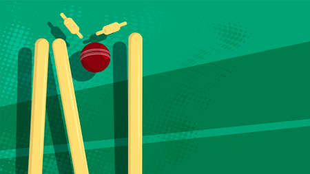 wooden cricket goal breaks red ball. Wicket with upper crossbars scatters to sides from athlete precise throw. Background sports competitions in cricket. Vector