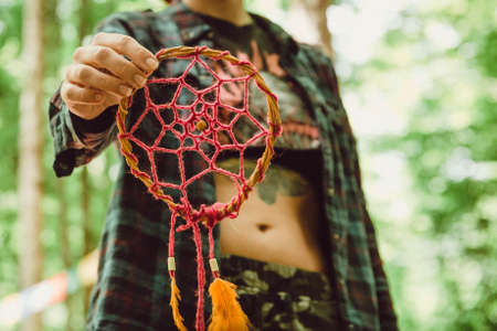 girl weaves a dream catcher in the forest. hand made