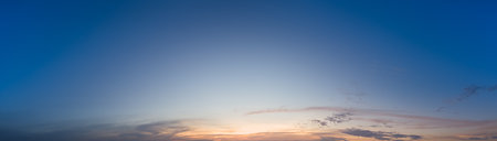 Warm sunny blue sky with fluffy clouds. Sunset sunlight illuminates the sky in sunset time. Beautiful ultra-wide panoramic background of atmosphere