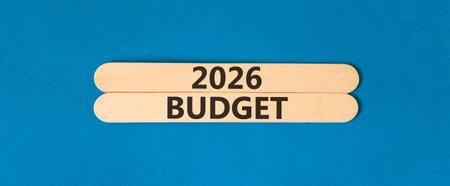 2026 Budget symbol. Concept words 2026 Budget on beautiful wooden sticks. Beautiful blue paper background. Business and 2026 budget concept. Copy space.