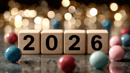 Close-up of wooden blocks spelling out 2026, surrounded by colorful spheres and blurred festive lights, symbolizing the upcoming new year.