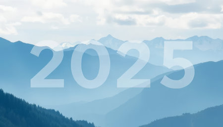 The mountains are blue and the sky is cloudy. The year is 2025. The mountains are covered in snow