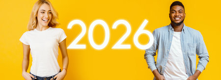 Young couple holding a red banner with the text Happy New Year.