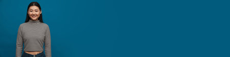 Happy young asian woman in casual clothes standing over blue wall background, looking at camera
