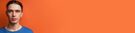 Young white man with earring posing and looking at camera isolated over orange background