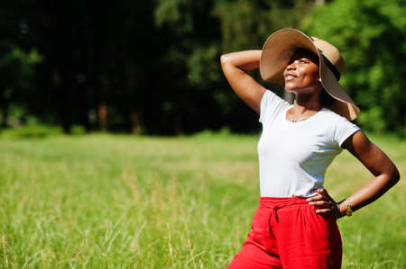 Portrait of gorgeous african american woman 20s wear in summer hat, red pants and white t-shirt, posing at green grass in park.