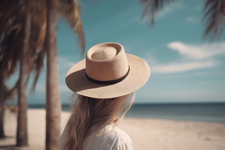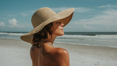 A serene moment captured of a woman enjoying her day at the beach, wearing a large straw hat while gazing over the ocean waves under a clear sky.