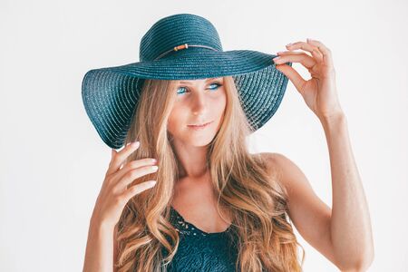 Beautiful stylish young woman, fashionable female model in summer white straw hat posing on blue wall background, looking away