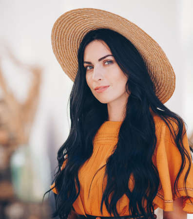 Portrait of beautiful young brunette woman with makeup in orange dress