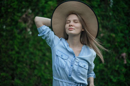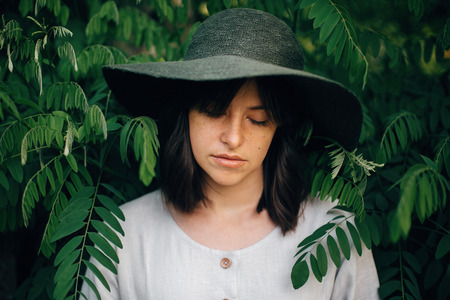 Stylish girl in linen dress posing at green branches. Portrait of calm boho woman in hat among acacia leaves in summer countryside in evening. Atmospheric calm moment