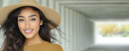 A woman with long wavy hair smiles warmly while wearing a stylish sun hat. She stands in a bright contemporary corridor infused with soft afternoon light creating an inviting atmosphere.