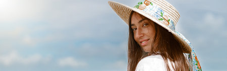 Close up portrait of a beautiful young woman in straw hat against blue sky