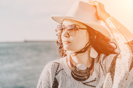 Portrait of a curly haired woman in a white hat and glasses on the background of the sea.