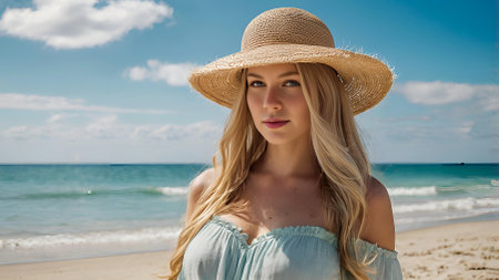 Portrait of beautiful woman in hat standing beach on the background of ocean during vacation