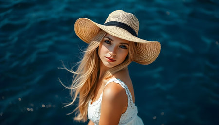 Woman in Straw Hat Gazing at a Tranquil Sea Serene Ocean View, Peaceful Moment in Nature