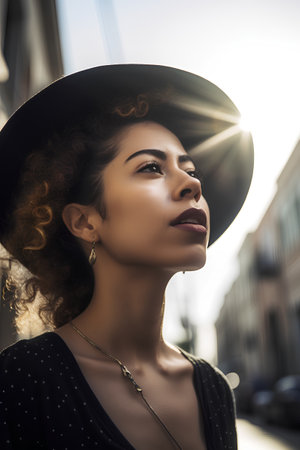 Young woman wearing sun hat and sunglasses outdoors under the sun. Fashionable woman in sunglasses and hat enjoying the sunlight. Summer elegance, natural style, relaxed atmosphere.