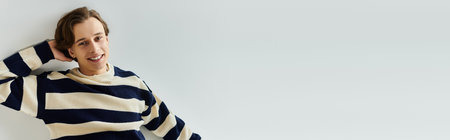 A cheerful young man enjoys a moment in a cozy striped sweater, embodying college spirit, banner