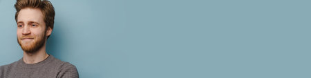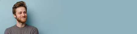 White ginger man with beard smiling and looking aside isolated over blue background