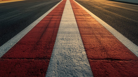 A close-up image of a racing track showcasing red and white stripes against a smooth asphalt surface, illuminated by warm evening light, ideal for sports or automotive themes.