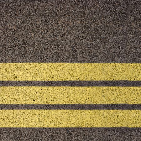 Black asphalt road texture with marking background. Horizontal double yellow line on asphalt road.