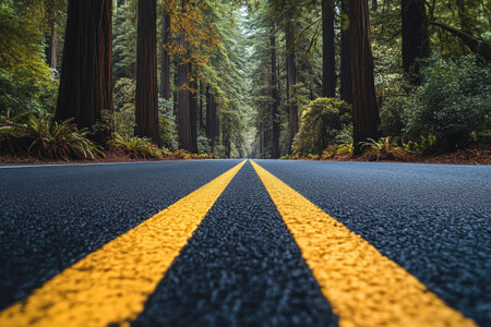 Scenic view of an empty asphalt road with yellow dividing lines leading through the redwood national park forest in California