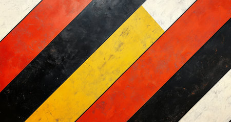 The vibrant arrangement consists of bold red, black, and yellow stripes intersecting on a textured background, creating an eye-catching, abstract design that draws attention with its colors and layout.