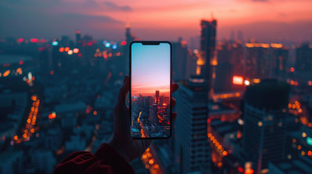 Tourist is holding in hands a smartphone and taking pictures of a colorful and beautiful sunset on the