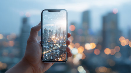 Hand held mobile phones take photos of tourism luminous cities, outdoor photos, and the background is fuzzy.