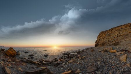 Panoramic view of a beautiful sunrise on the Black Sea coast and a silhouette of a photographer on the right side