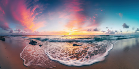 Serene beach at sunrise with a multicolored sky behind. Paradise tropical beach at sunset, sea waves and surf, fine sand