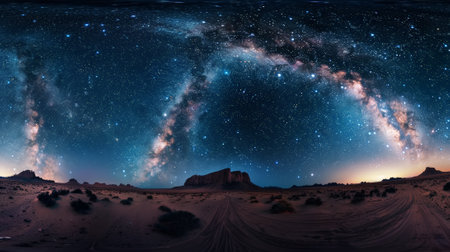 Panoramic view of the night starry sky with the Milky Way. Mountain tourism, camping. Generative AI.