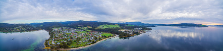 Aerial panorama of North West Bay and town of Snug near Hobart at sunset. Tasmania, Australia